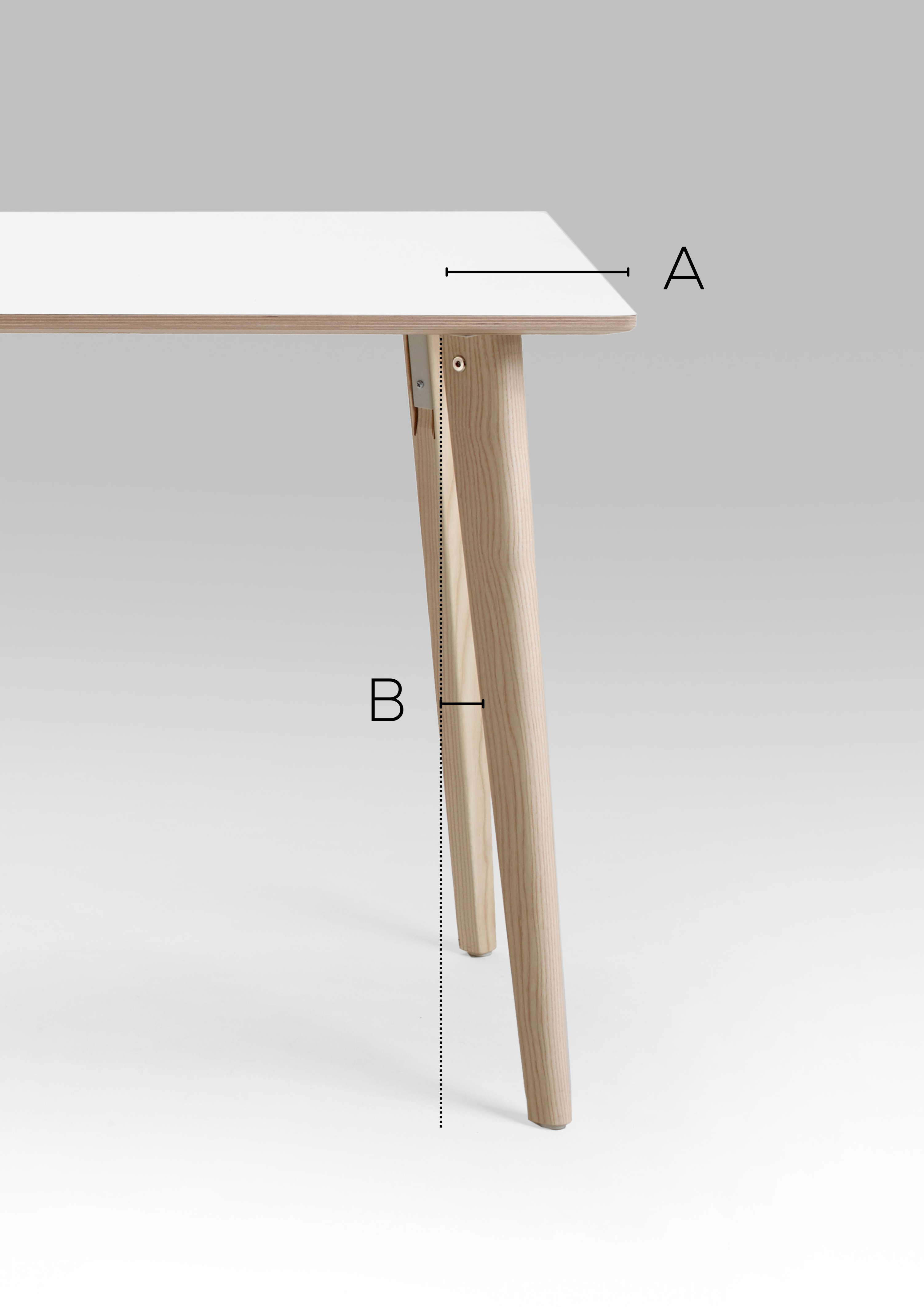 The metal bracket of the leg, in white RAL 9003, is an integrated visible part of the table leg without the use of glue.