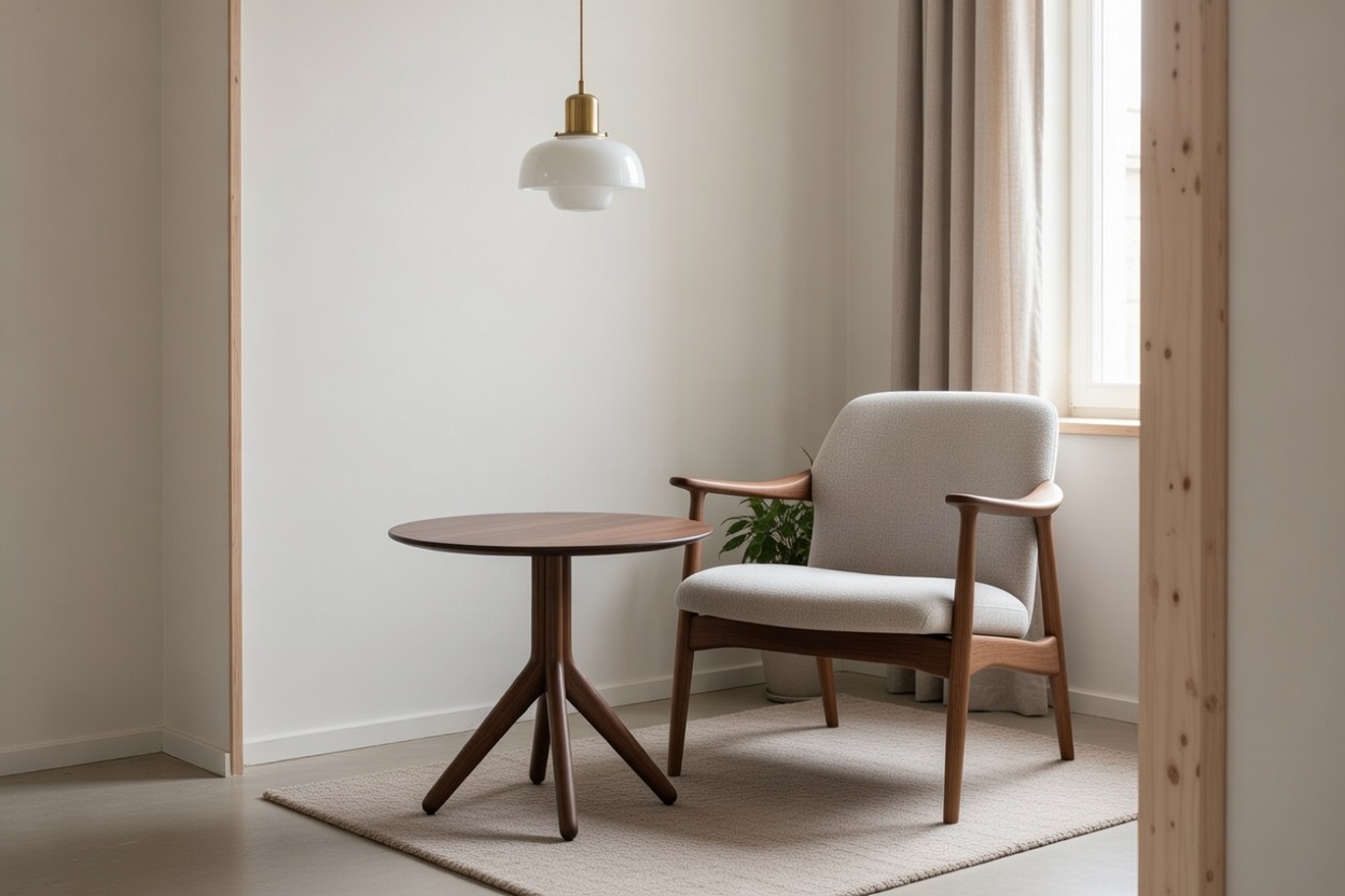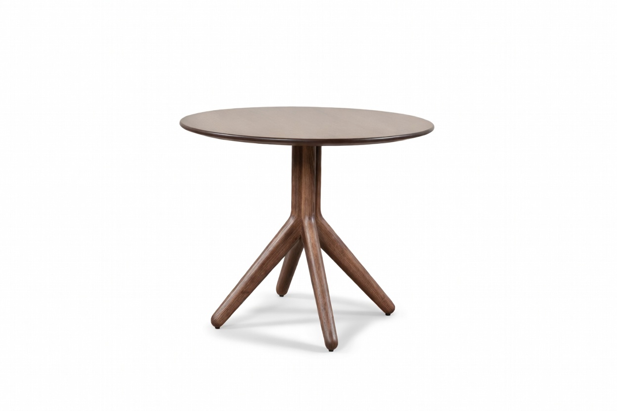 Bord deklarert med Möbelfakta og Environmental product declaration (EPD). Sargfritt tresøylebord med forgrenet stativ helt i massivt tre. Limfri montering og designet for en sirkulær møbelflyt. Søylebordet har en distinkt og elegant profil og gir mulighet for fri sitting ved bordet.